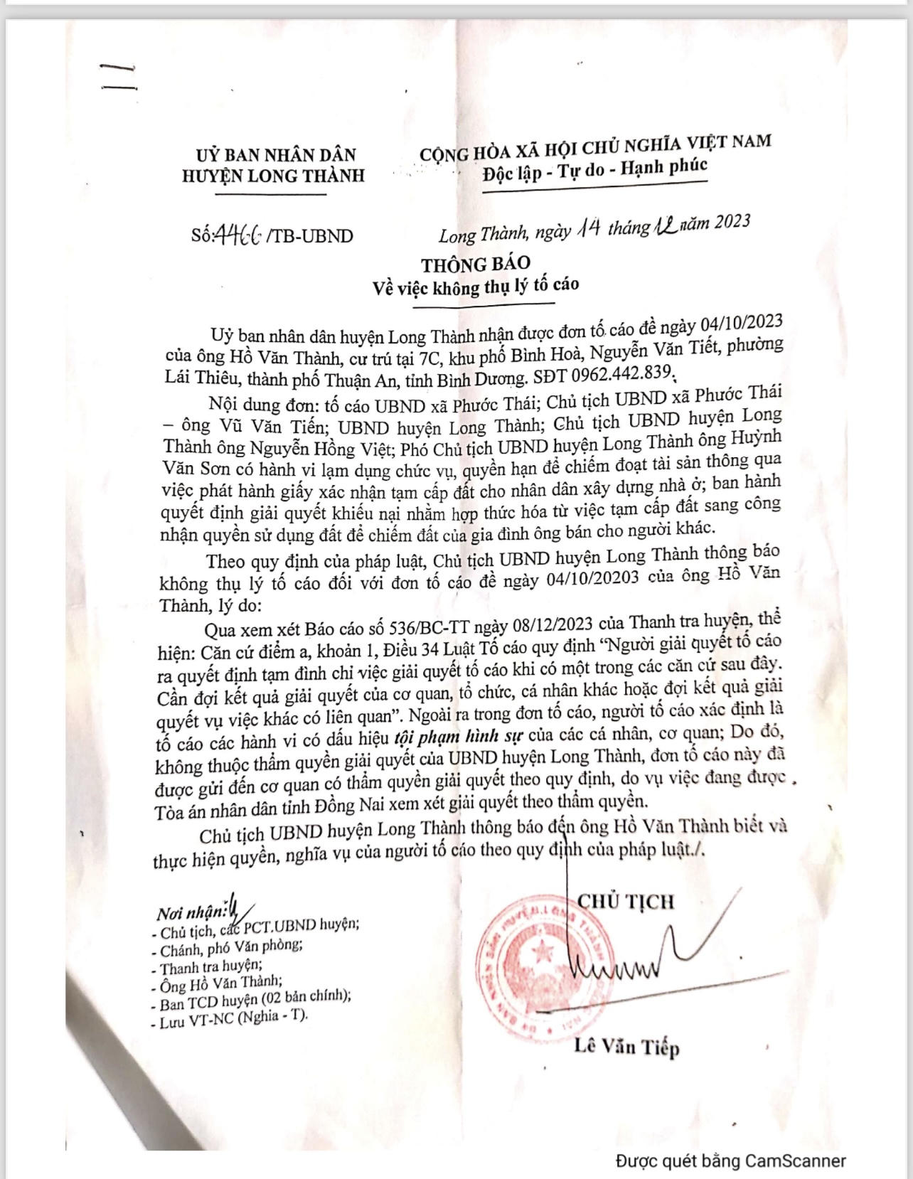 Tuy nhiên ngày 14/12/2023, UBND huyện Long Thành ra Thông báo 4466/TB-UBND không thụ lý tố cáo của ông Thành. Theo đó: “Qua xem xét Báo cáo 536/BC-TT ngày 8/12/2023 của Thanh tra huyện, thể hiện: Căn cứ điểm a khoản 1 Điều 34 Luật Tố cáo quy định “Người giải quyết tố cáo ra quyết định tạm đình chỉ việc giải quyết tố cáo khi có một trong các căn cứ sau đây. Cần đợi kết quả giải quyết của cơ quan, tổ chức, cá nhân khác hoặc đợi kết quả giải quyết vụ việc khác có liên quan””.