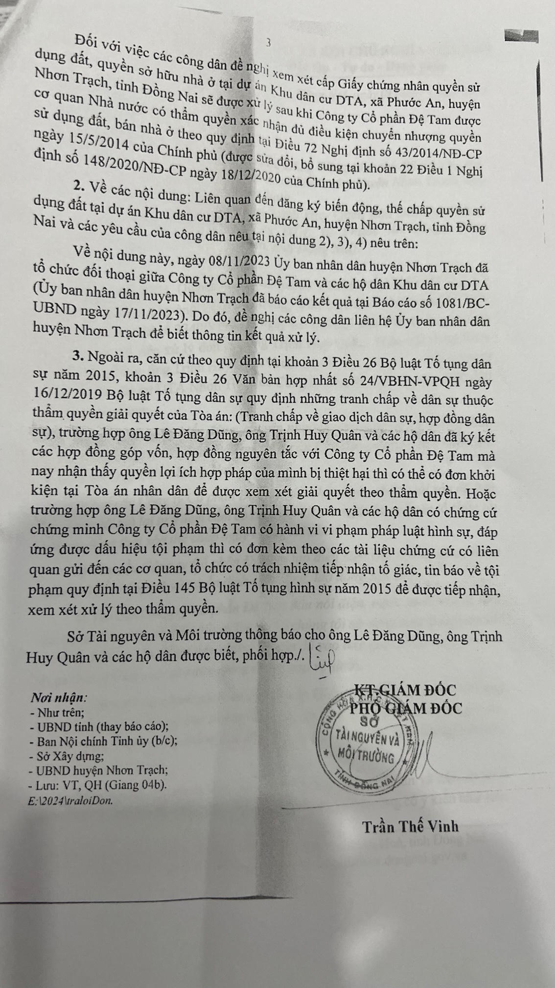 Văn bản do Phó Giám đốc Sở TN&MT Trần Thế Vinh ký, nêu rõ: “Trường hợp các hộ dân có chứng cứ chứng minh DETACO có hành vi vi phạm pháp luật hình sự, đáp ứng được dấu hiệu tội phạm, thì có đơn kèm theo các tài liệu chứng cứ có liên quan; gửi đến các cơ quan, tổ chức có trách nhiệm tiếp nhận tố giác, tin báo về tội phạm quy định tại Điều 145 Bộ luật Tố tụng Hình sự 2015 để được tiếp nhận, xem xét xử lý theo thẩm quyền”.