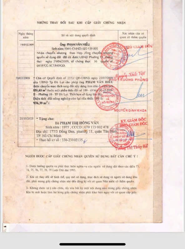 Hồ sơ cho thấy, gia đình bà Phạm Thị Hồng Vân (SN 1973, ngụ quận Tân Bình, TP HCM) vào năm 2009 mua thửa đất 189, tờ bản đồ D94II, diện tích 1.828m2 tại số 5 đường Khe Sanh (phường 10, TP Đà Lạt), do cha bà Vân đứng tên.