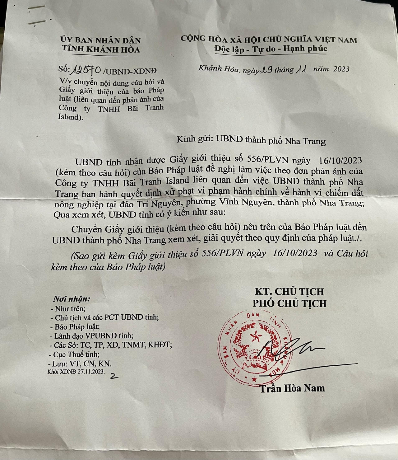 Một số nội dung chưa rõ ràng trong sự việc, PV đã đặt câu hỏi với UBND phường Vĩnh Nguyên, TP Nha Trang và tỉnh Khánh Hòa vào ngày 23/11/2023. Ngày 29/11/2023, UBND tỉnh có Văn bản 12570/UBND-XDNĐ chuyển nội dung sự việc đến UBND TP Nha Trang xem xét giải quyết theo quy định.