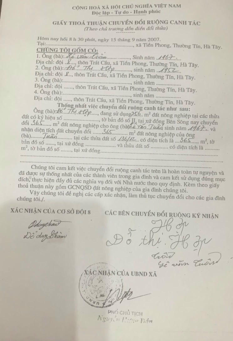 Đơn của một số hộ dân tại đội 8, thôn Trát Cầu, xã Tiền Phong, huyện Thường Tín, TP Hà Nội cho rằng, họ không nhận được đất dịch vụ sau khi đã đổi theo hướng dẫn của một số cá nhân và xác nhận của Phó Chủ tịch UBND xã.