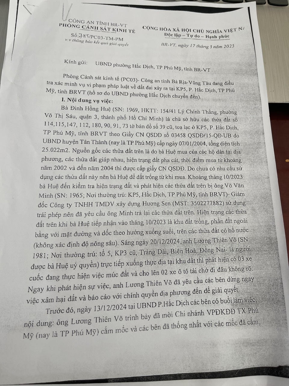 Theo thông tin từ Phòng Cảnh sát kinh tế Công an BR-VT, người bị xâm phạm quyền sử dụng đất là bà Đinh Hồng Huệ (SN 1969, hộ khẩu thường trú quận 3, TP HCM). Bà Huệ là chủ sử dụng hợp pháp của các thửa đất số 114, 115, 147, 112, 180, 90, 91 và 73 (tờ bản đồ số 39 cũ), tổng diện tích 25.022m², được UBND huyện Tân Thành (nay là TP Phú Mỹ) cấp sổ đỏ từ 2004.