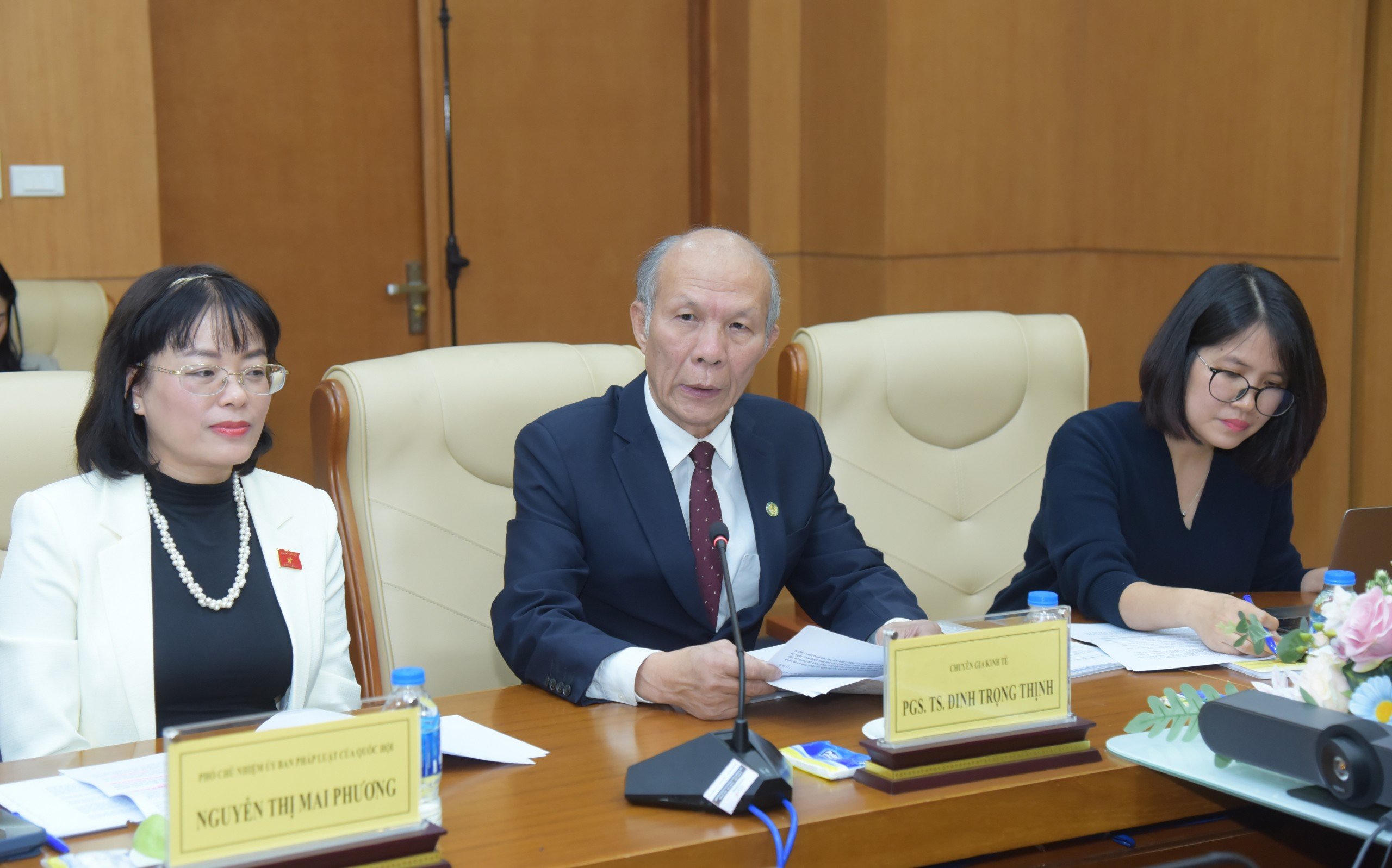Bà Nguyễn Thị Mai Phương, Phó Chủ nhiệm Ủy ban Pháp luật của Quốc hội và PGS.TS. Đinh Trọng Thịnh, chuyên gia kinh tế tại Tọa đàm. |
