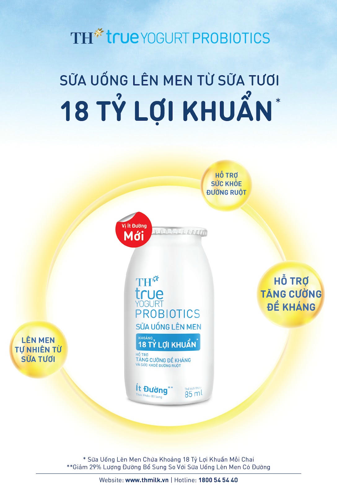 Và mới nhất, Sữa Uống Lên Men Ít Đường TH true YOGURT PROBIOTICS không chỉ là một bước tiến về dinh dưỡng mà còn thể hiện cam kết của TH trong việc đồng hành cùng người tiêu dùng xây dựng lối sống lành mạnh.
