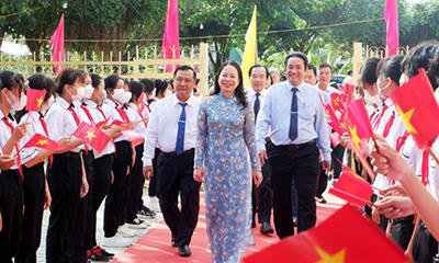 Phó Chủ tịch nước Võ Thị Ánh Xuân đến dự Ngày hội đại đoàn kết tại ấp Cần Thuận, xã Cần Đăng, huyện Châu Thành, tỉnh An Giang. |