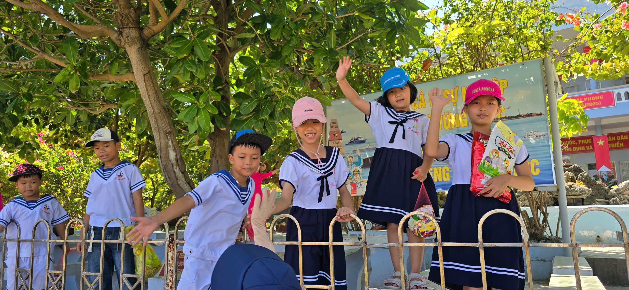 Các em nhỏ vui tươi vẫy chào khi Đoàn công tác ghé thăm đảo |