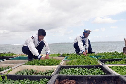 Ở Trường Sa Đông, chiến sĩ còn bội thu hơn. Một năm tăng gia gần 6 tấn rau xanh, hơn 2 tấn cá, hơn 1,5 tấn thịt các loại. Không chỉ đảm bảo bữa ăn tươi cho chiến sĩ và hỗ trợ ngư dân, các đảo còn có quà gửi lại đất liền. Rau xanh là thế mạnh của các đảo nổi.