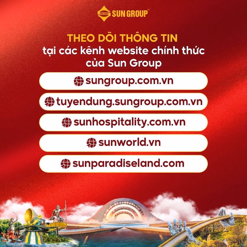 Tập đoàn Sun Group cho biết chỉ sử dụng website và Fanpage chính thức và duy nhất sau đây: Website Tập đoàn: https://sungroup.com.vn/; Fanpage Tập đoàn: https://www.facebook.com/tapdoanmattroi; Website Tuyển dụng: https://tuyendung.sungroup.com.vn/; Fanpage Tuyển dụng: https://www.facebook.com/tdsungroup