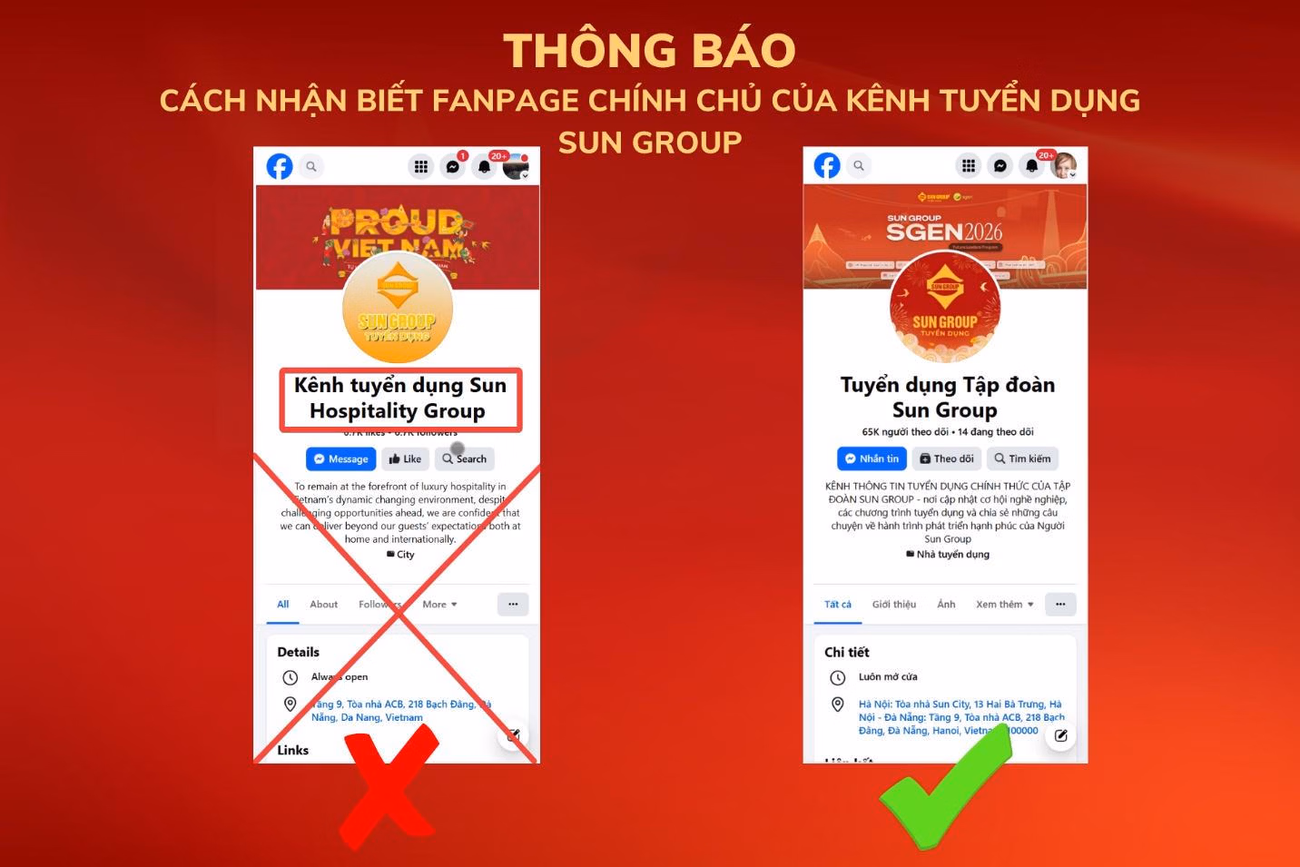Cũng trong năm vừa qua, vào tháng 5/2025, một trang fanpage mạo danh "Kênh tuyển dụng Sun Hospitality Group" cũng được lập ra với địa chỉ IP được quản lý từ nước ngoài (Campuchia), sử dụng email và số điện thoại giả mạo để lừa gạt ứng viên.
