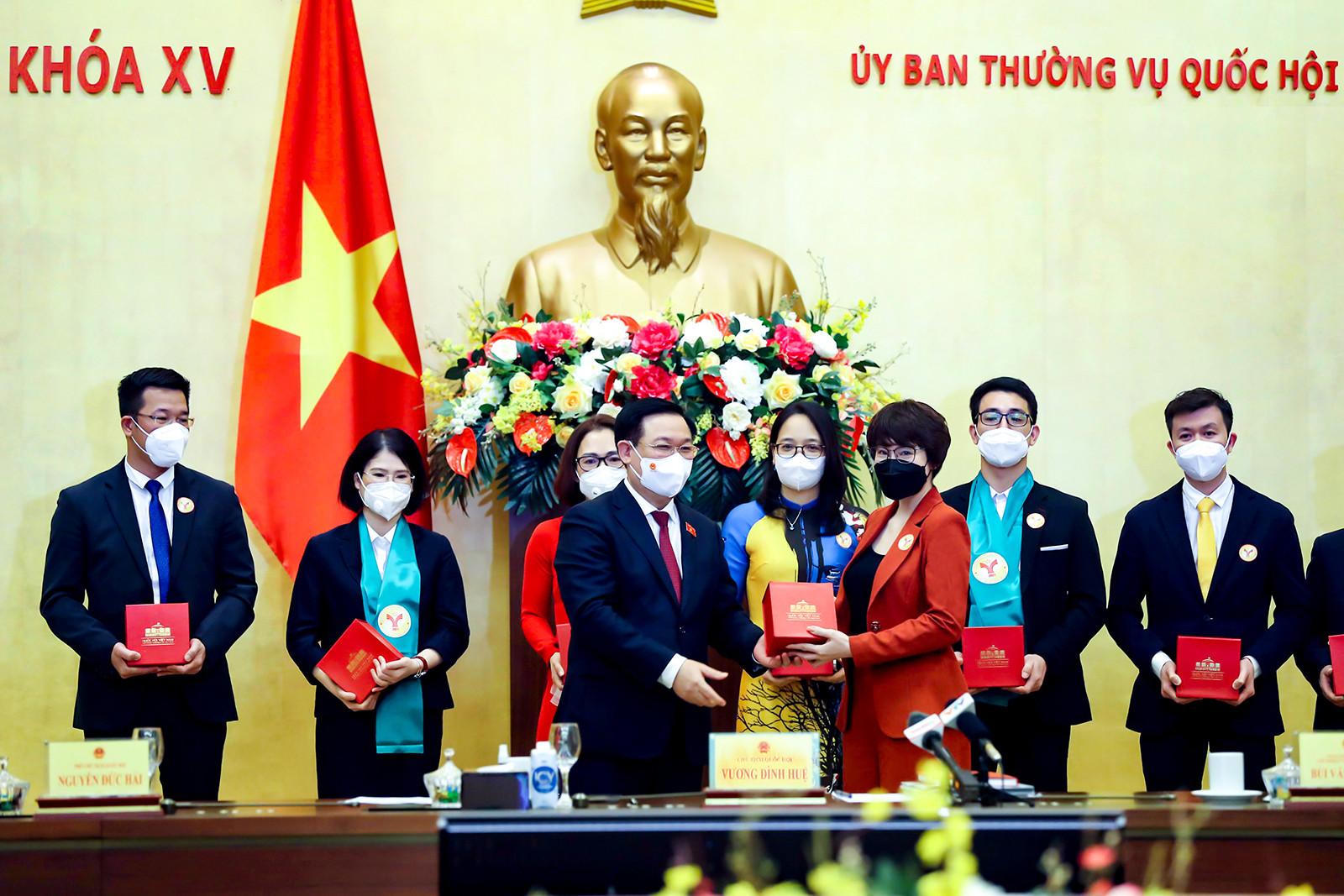 Chủ tịch Quốc hội Vương Đình Huệ tặng quà lưu niệm cho đại diện Sunshine Group cùng đại diện lãnh đạo các doanh nghiệp tiêu biểu