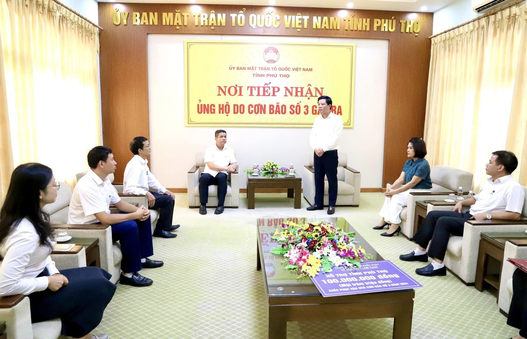 Phó Chủ tịch Ủy ban MTTQ tỉnh Phú Thọ gửi lời cảm ơn sâu sắc tới Lãnh đạo, cán bộ và người lao động Công ty đã kịp thời động viên, chia sẻ khó khăn với nhân dân tỉnh Phú Thọ; đồng thời khẳng định tỉnh sẽ phân bổ hợp lý các nguồn lực được hỗ trợ và triển khai thực hiện các biện pháp khắc phục hậu quả sau bão cho bà con nhân dân trên địa bàn tỉnh.