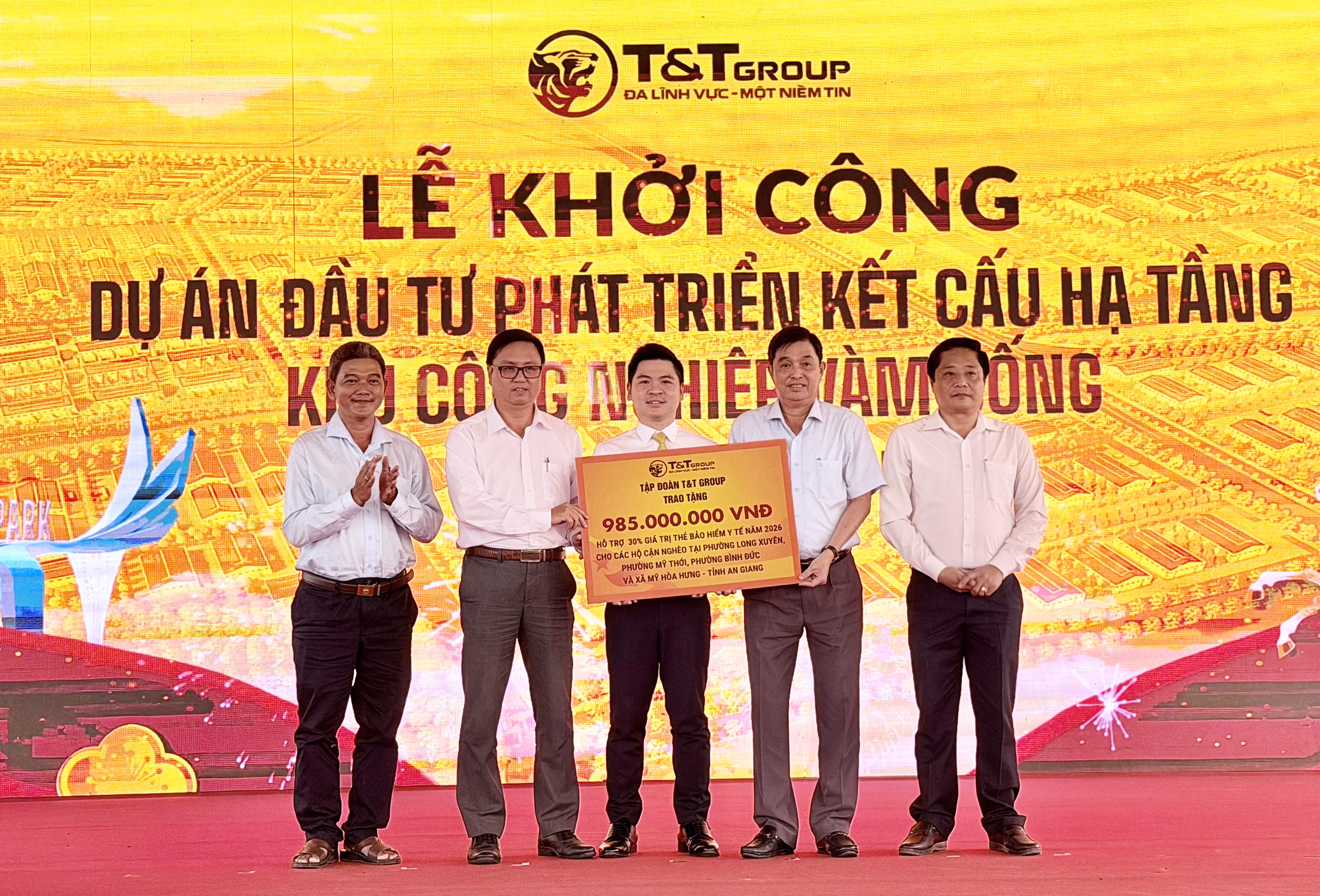 Trong khuôn khổ Lễ khởi công, Tập đoàn T&T Group đã trao ủng hộ gần 1 tỷ đồng nhằm hỗ trợ 30% giá trị thẻ bảo hiểm y tế năm 2026 cho các hộ cận nghèo tại các phường, xã: Long Xuyên, Mỹ Thới, Bình Đức và Mỹ Hòa Hưng.