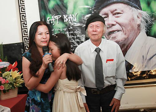 | Con gái nhà thơ Thanh Tùng (trái) và cháu ngoại khóc khi đọc thơ tặng ông tại tiệc sinh nhật mừng thọ ông tuổi 80 (năm 2015). Ảnh: Thoại Hà. |
