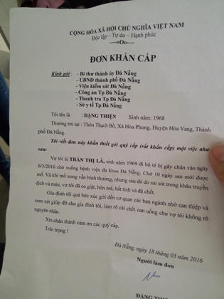| Không đồng tình với giải thích của bệnh viện, song song đưa thi thể bà Là về nhà, gia đình làm đơn gửi các cơ quan chức năng nhờ vào cuộc làm rõ cái chết của bà |