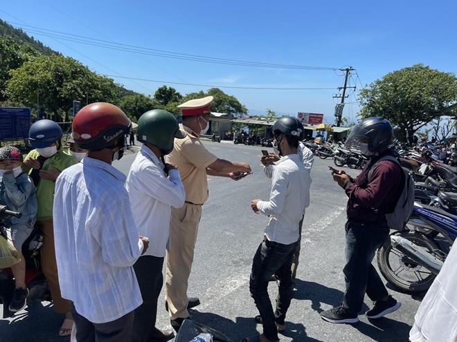 Theo đó, trong sáng 20/6, nhiều người dân điều khiển mô tô, xe máy, ô tô lưu thông hướng Đà Nẵng - Huế, khi đến đỉnh đèo Hải Vân đã được lực lượng CSGT Công an tỉnh Thừa Thiên Huế và Cảnh sát cơ động của Bộ Công an làm nhiệm vụ tại Chốt kiểm soát trên đỉnh đèo Hải Vân yêu cầu quay lại để khai báo y tế tại Chốt kiểm soát y tế gần Hầm đường bộ Hải Vân.