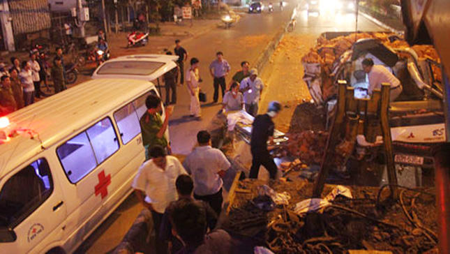 Tại hiện trường, cú đâm cực mạnh khiến xe tải biến dạng hoàn toàn. Anh Nguyễn Hữu Phước (SN 1995, quê tỉnh Vĩnh Long) phụ xe tải chết thảm. Tài xế Giang cùng phụ xe khác nguy kịch. Hàng chục tấn gạch đổ xuống đường.