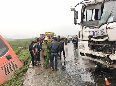 Khoảng 15h30 phút chiều 25/2, xe khách giường nằm BKS 38B - 05586 do lái xe tên Hoàn (trú tại xã Phù Việt, Thạch Hà, Hà Tĩnh) điều khiển chạy theo hướng Bắc - Nam, khi đến địa phận xã Hưng Đạo (Hưng Nguyên, Nghệ An) xảy ra va chạm với chiếc xe tải BKS 37C - 1156 do tài xế Phạm Viết Cường (45 tuổi, trú tại phường Quán Bàu, TP.Vinh) điều khiển ngược chiều.