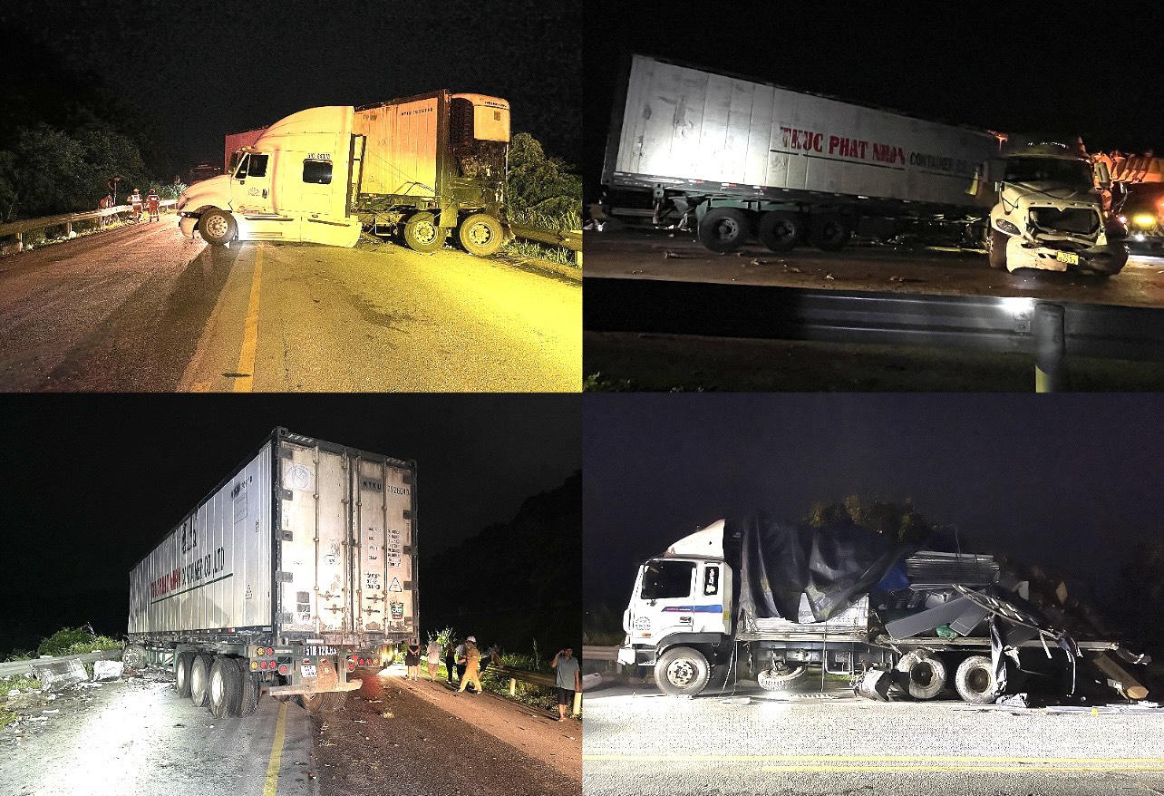 Tại hiện trường, 3 ôtô đều bị hư hỏng nặng, phần đuôi của xe khách chắn ngang đường. Ôtô đầu kéo bị gãy gập cabin và phần rơ-moóc chở hàng, nhiều mảnh vỡ vương vãi khắp mặt đường.