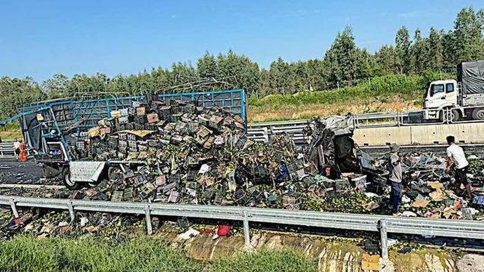 Vụ tai nạn làm 2 người bị thương nặng và đang được cấp cứu. Các phương tiện đều hư hỏng, nhiều hàng hóa là các giỏ trái cây trên xe rơi xuống đường.
