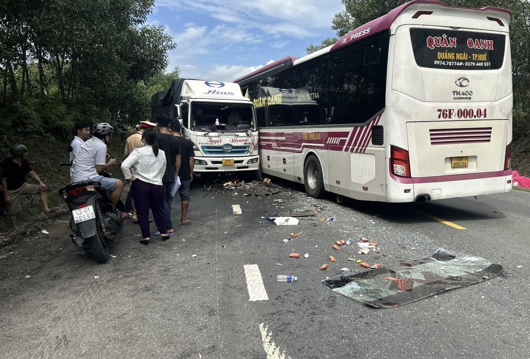 Tại hiện trường, xe khách và xe tải hư hỏng nặng phần đầu, kính chắn gió vỡ vụn văng khắp mặt đường. Còn xe máy bị văng qua sát lề đường, hư hỏng nặng.