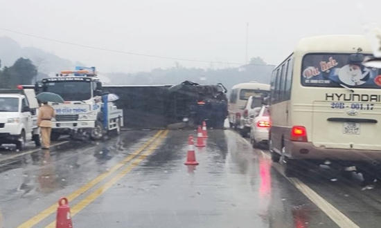 | Chiếc xe gặp tai nạn trên địa phận qua tỉnh Yên Bái khiến giao thông bị ngưng trệ ít phút (Anht: CTV) |