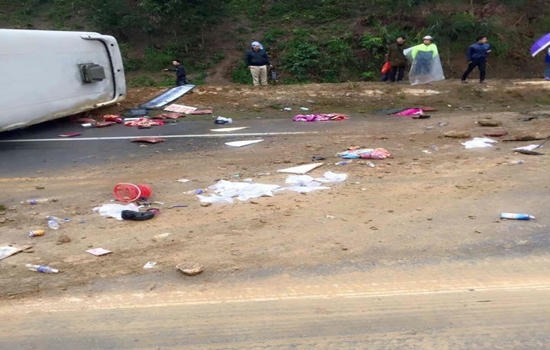 | Chiếc xe khách bị mất lái, lật, nằm quay ngang đường (Ảnh: CTV) |
