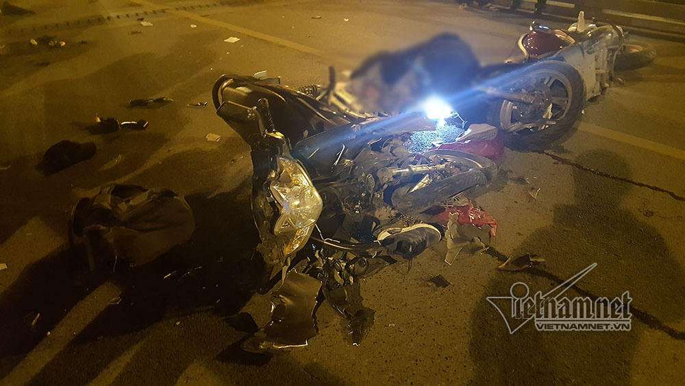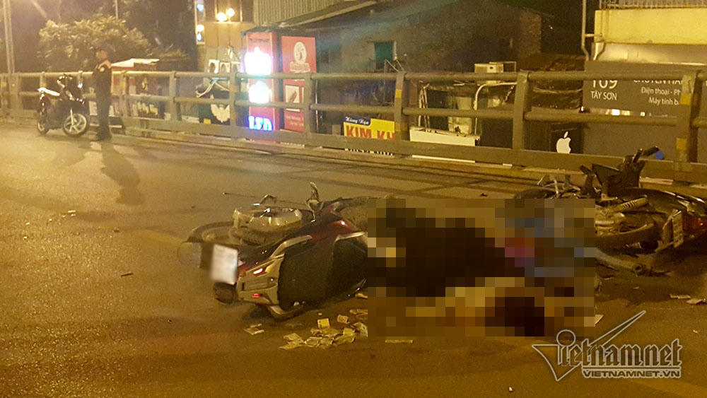 Tại hiện trường, 2 xe máy bị hư hỏng nặng, nhiều mảnh vỡ văng khắp thành cầu, một số mảnh vỡ còn bay xuống mặt đường Tây Sơn. Nạn nhân nam tử vong vẫn trong tư thế ngồi trên xe.