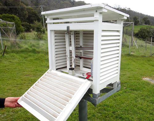 Stevenson Screen chứa nhiệt kế đo nhiệt độ không khí được thiết kế bằng gỗ, sơn màu trắng, có các khe thoáng khí ở bên, đặt trên mặt cỏ cao khoảng 1,5 mét. |