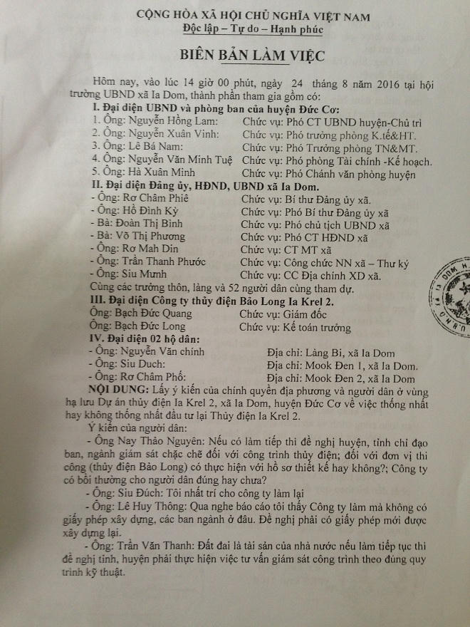 Ông Rơ Lan Dút – Phó chủ tịch xã Ia Dom cho biết thêm: Ngày 24/08/2016 UBND xã đã tiến hành mời đại diện của 232 hộ dân trong khu vực dự án thủy điện Ia Krel 2 lên để lấy ý kiến thì tất cả đều đồng ý cho dự án tái xây dựng lần 3 (?!).