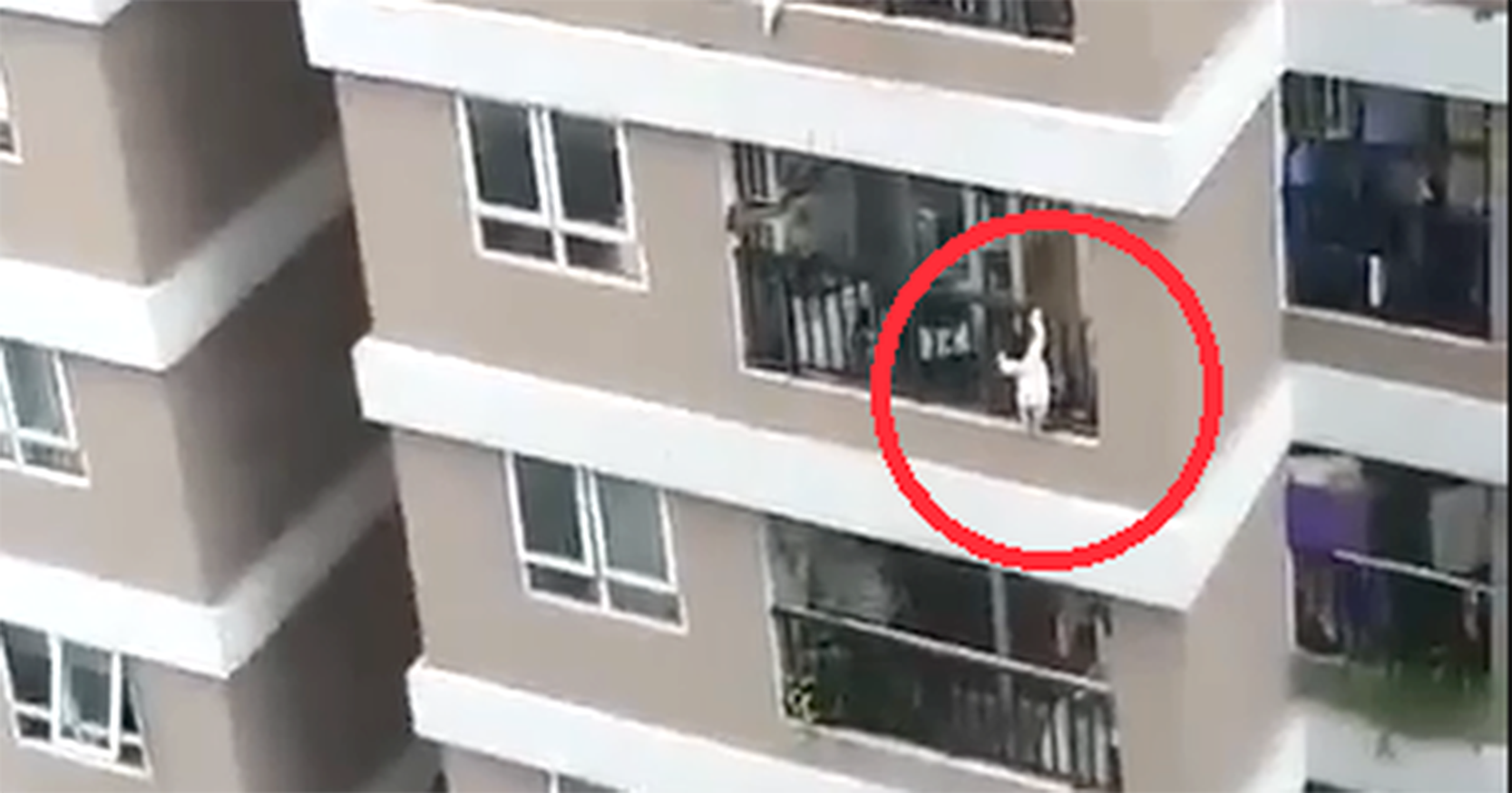 Khoảnh khắc cháu bé lơ lửng tại ban công tầng 12. |