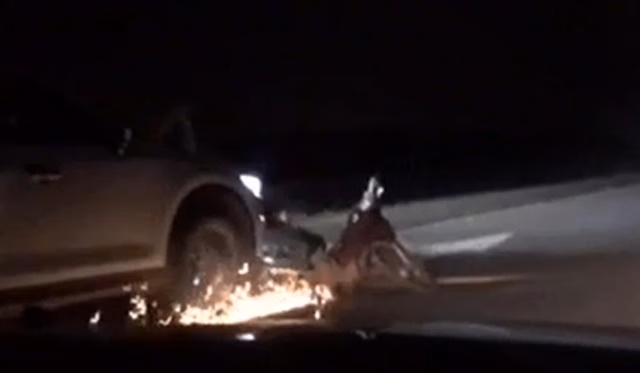 Sau khi xảy ra tai nạn, tài xế xe ô tô đã không chịu dừng lại mà tiếp tục di chuyển, kéo theo xe mô tô đi khoảng 2 km, gây tóe lửa trên mặt đường.