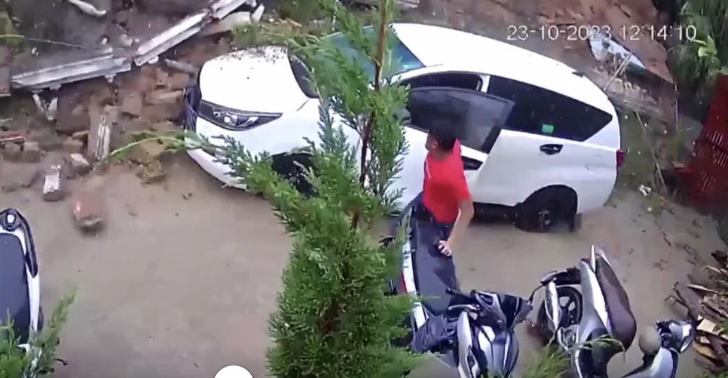 Tài xế nhanh chân nhảy ra khỏi ô tô dưới bờ taluy sạt lở