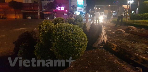 Chiếc xe tiếp tục húc bay hai chậu cây xanh lớn văng hàng chục mét từ vòng xoay xuống lề đường, bể nát. Chiếc ôtô sau đó tiếp tục lao xuống lòng đường và chỉ chịu dừng lại khi đã phóng sang lề đường đối diện.