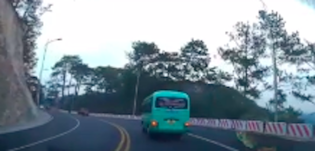 Chiếc xe buýt vượt ẩu trên đèo Prenn (ảnh cắt từ clip). |