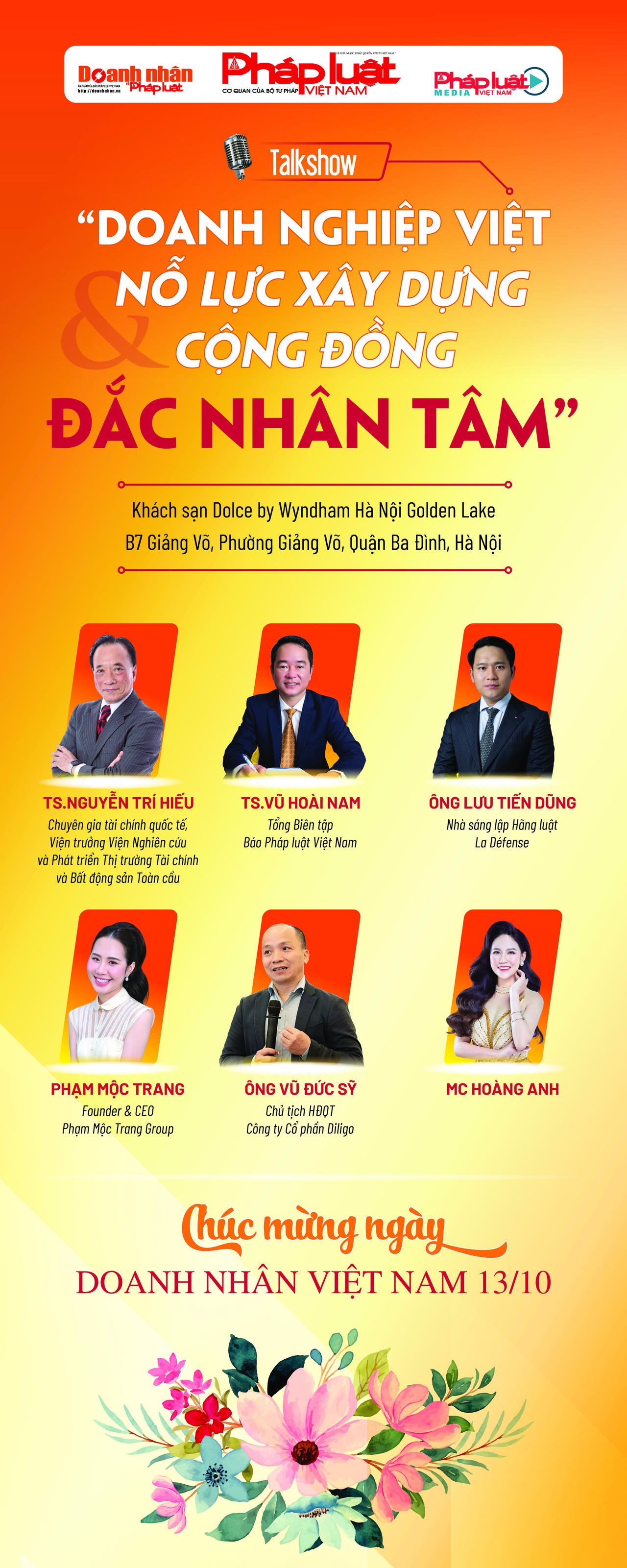 Buổi Talk Show sẽ có sự tham gia của TS. Nguyễn Trí Hiếu – Chuyên gia Tài chính Quốc tế, Viện trưởng Viện Nghiên cứu và Phát triển Thị trường Tài chính và Bất động sản Toàn cầu và các doanh nhân nổi tiếng như: Ông Vũ Đức Sỹ – Chủ tịch HĐQT Công ty Cổ phần Diligo, Ông Lưu Tiến Dũng – Nhà sáng lập Hãng luật La Défense, và Bà Phạm Mộc Trang – Founder & CEO Phạm Mộc Trang Group.