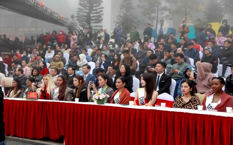 Các đại biểu và thí sinh Hoa hậu Du lịch thế giới tại lễ đón nhận giải thưởng du lịch thế giới “Tam Đảo – Thị trấn điểm đến hàng đầu thế giới” năm 2022. |