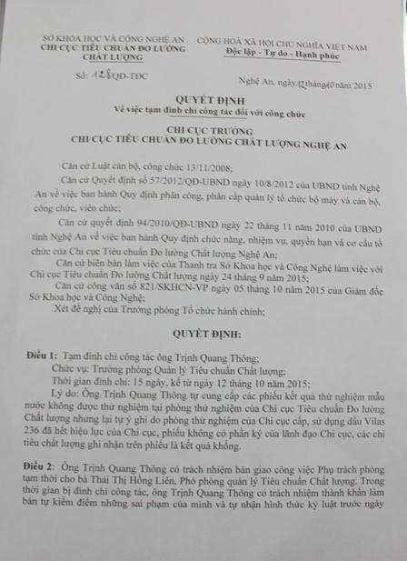 (PLO) - Chiều ngày 5/11, Chi cục trưởng Chi cục Tiêu chuẩn đo lường chất lượng Nghệ An, ông Phan Ngọc Quang cho biết, cơ quan này vừa tiếp tục gia hạn quyết định tạm đình chỉ công tác 15 ngày đối với ông Trịnh Quang Thông, Trưởng phòng Tiêu chuẩn chất lượng của chi cục này để làm rõ những sai phạm đoàn thanh tra phát hiện trong việc cấp kết quả kiểm nghiệm sản phẩm chất lượng nước đóng chai trên địa bàn.