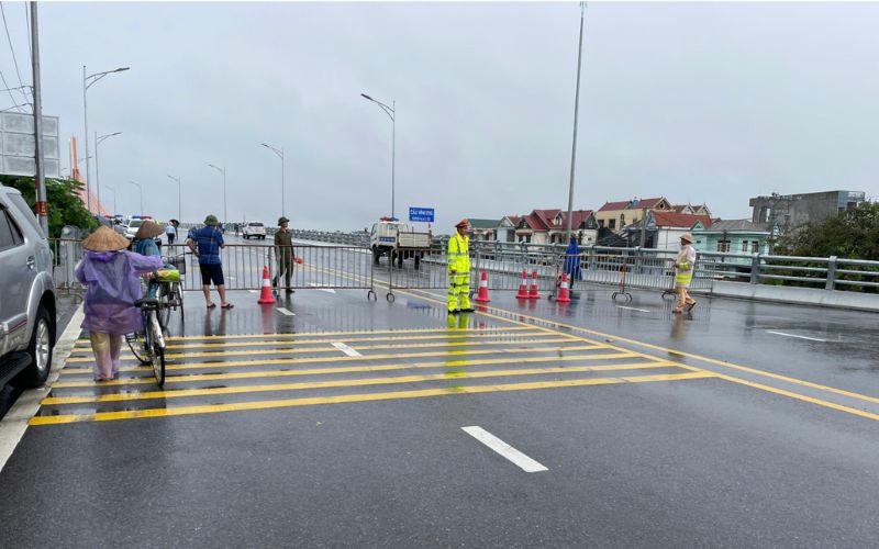 | Lực lượng chức năng lập rào chắn cấm tạm thời các phương tiện lưu thông qua cầu Vĩnh Phú. Ảnh: Hoàng Sơn |