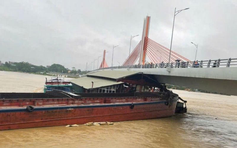 Sáng 10/9, do ảnh hưởng mưa bão, mực nước sông Lô dâng cao ở mức báo động. Do dòng nước chảy xiết, một số phương tiện tàu, thuyền bị mắc vào chân cầu Vĩnh Phú.