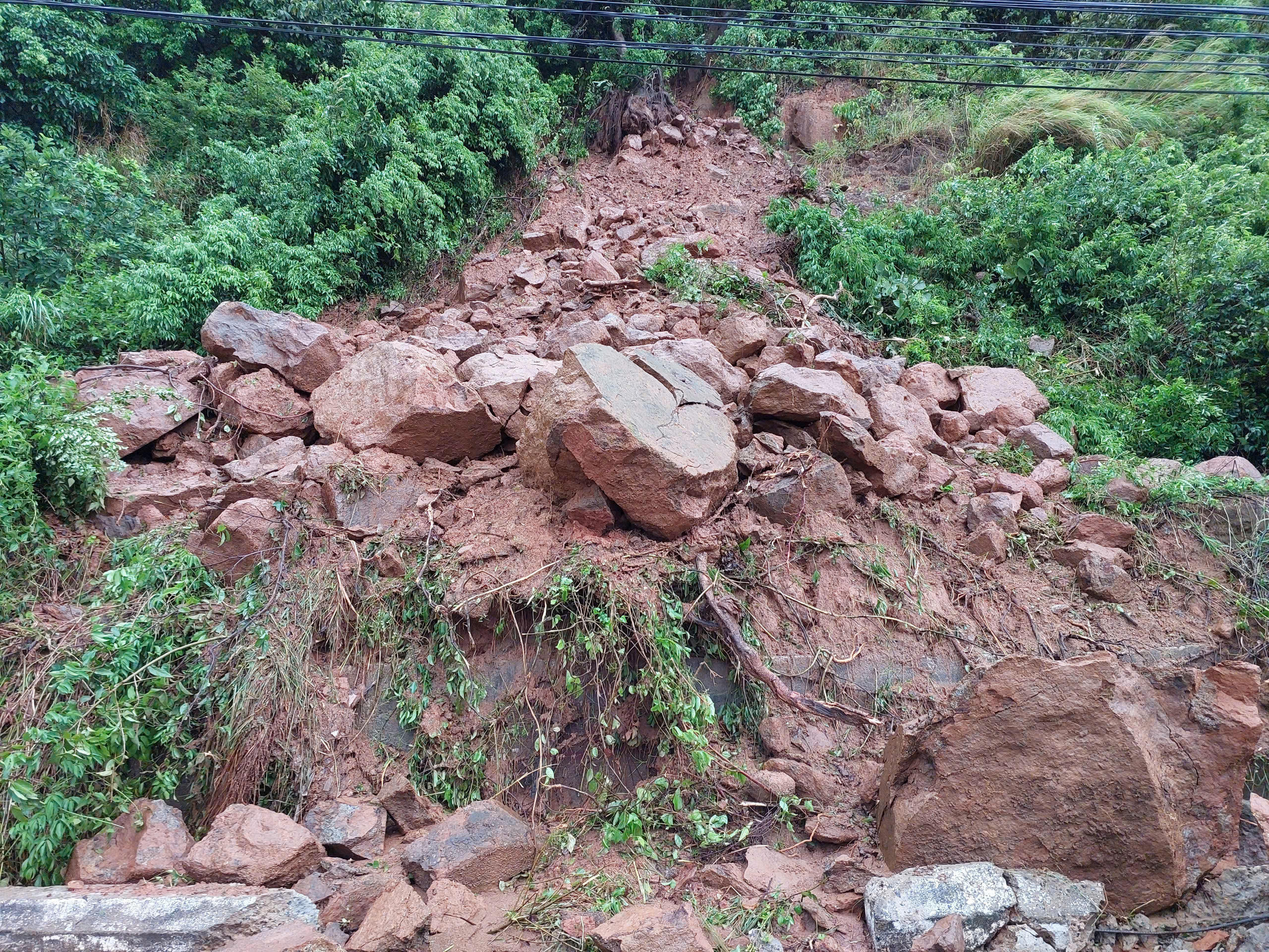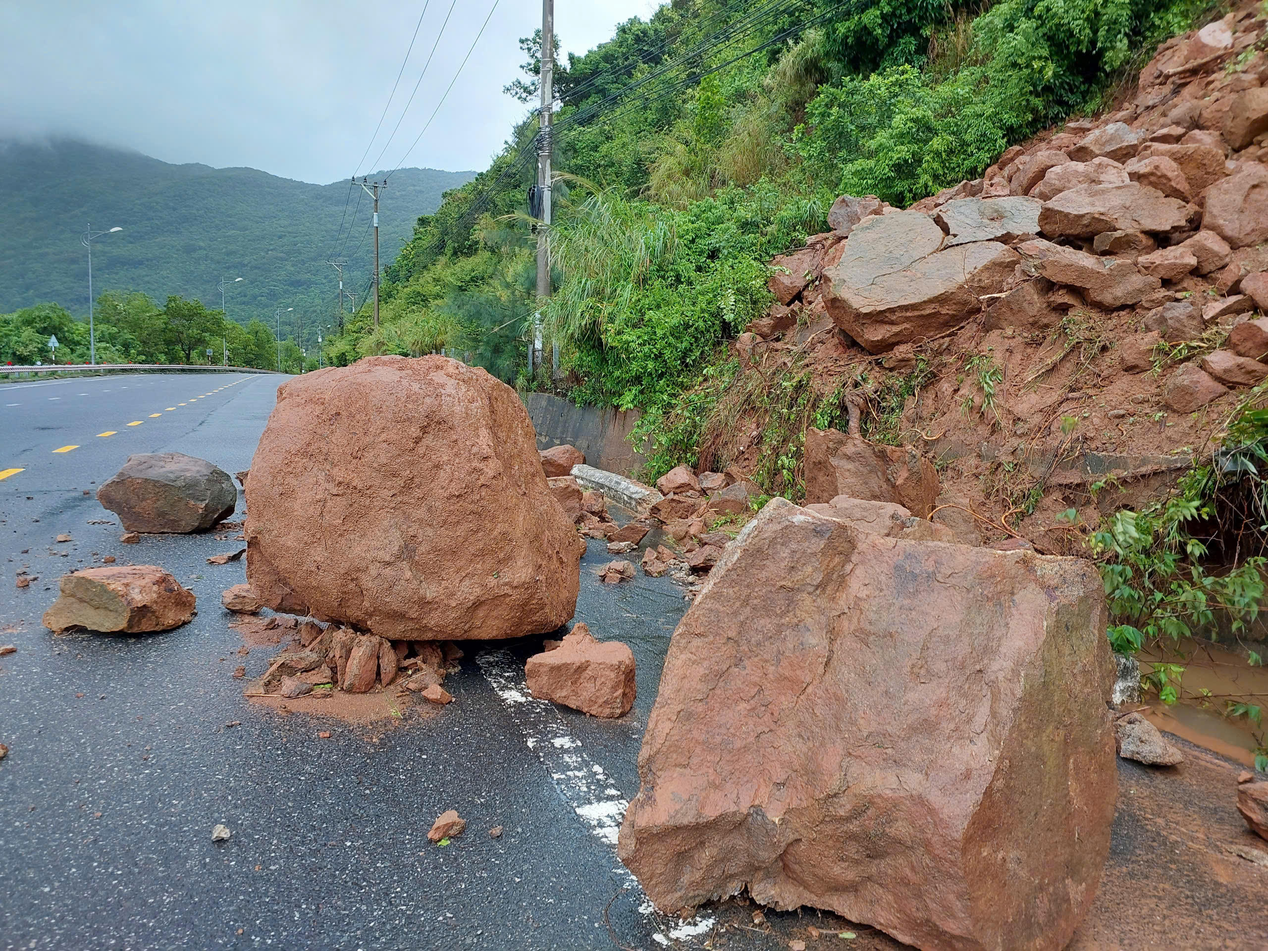 Một số tảng đá lớn nặng hơn 1 tấn cũng lăn xuống, tiềm ẩn nguy cơ tai nạn giao thông.