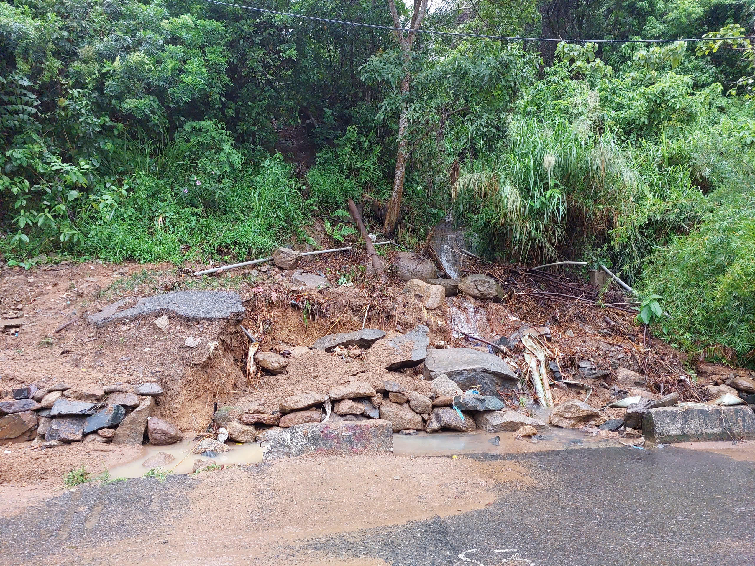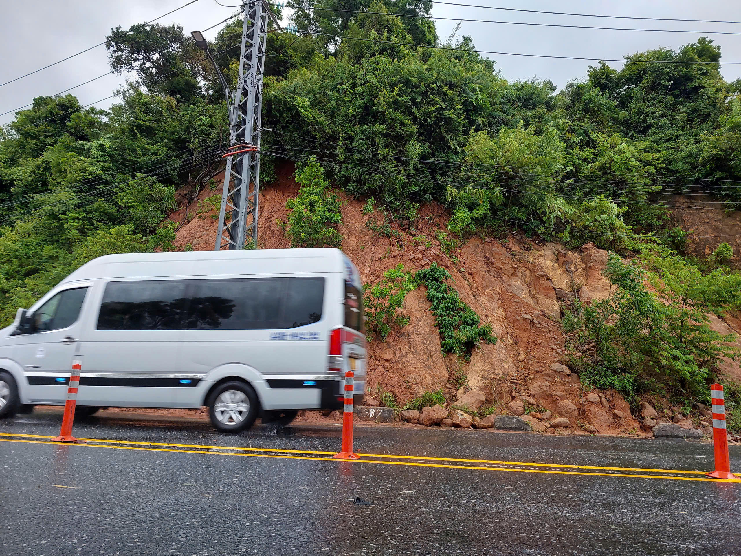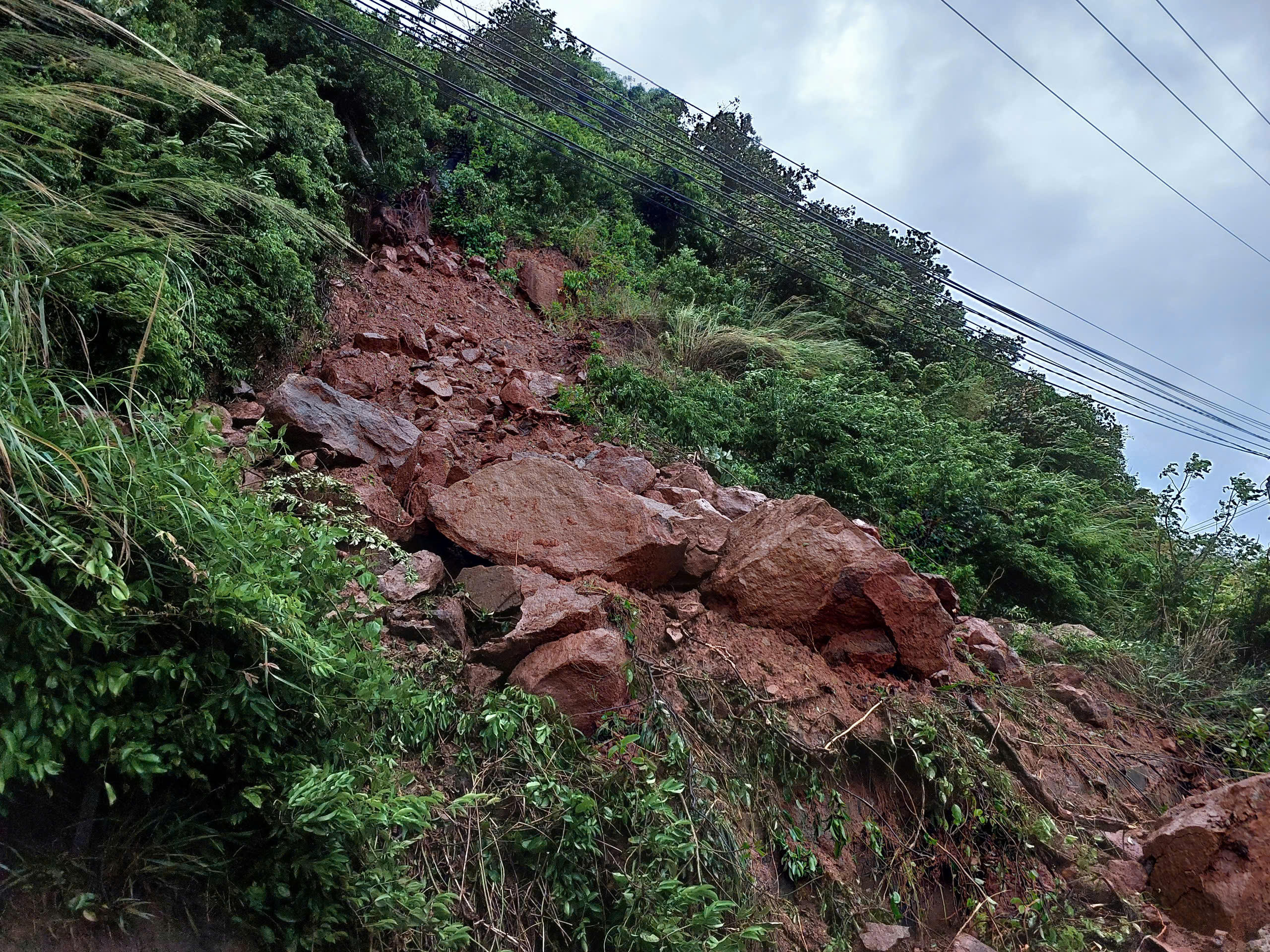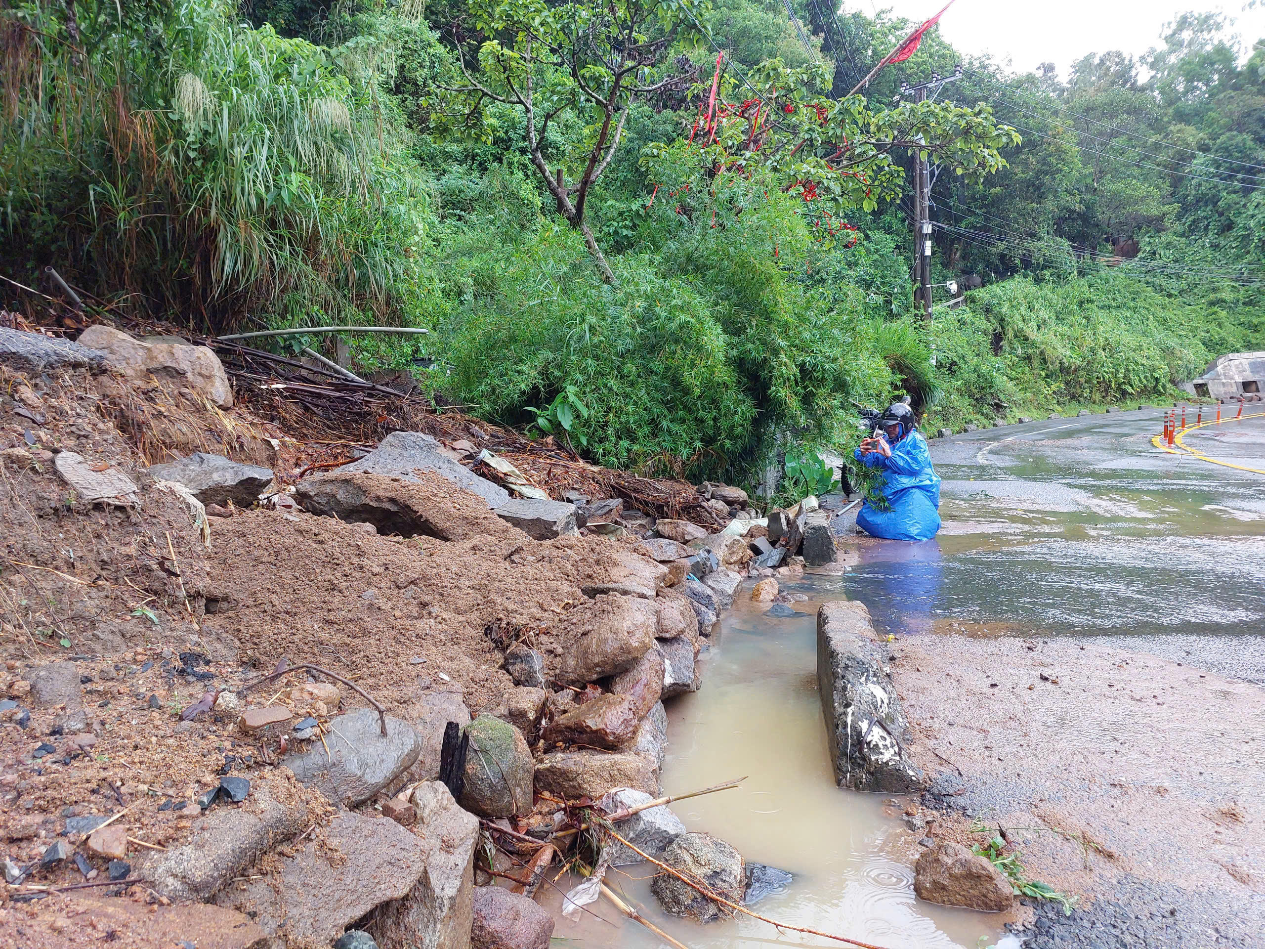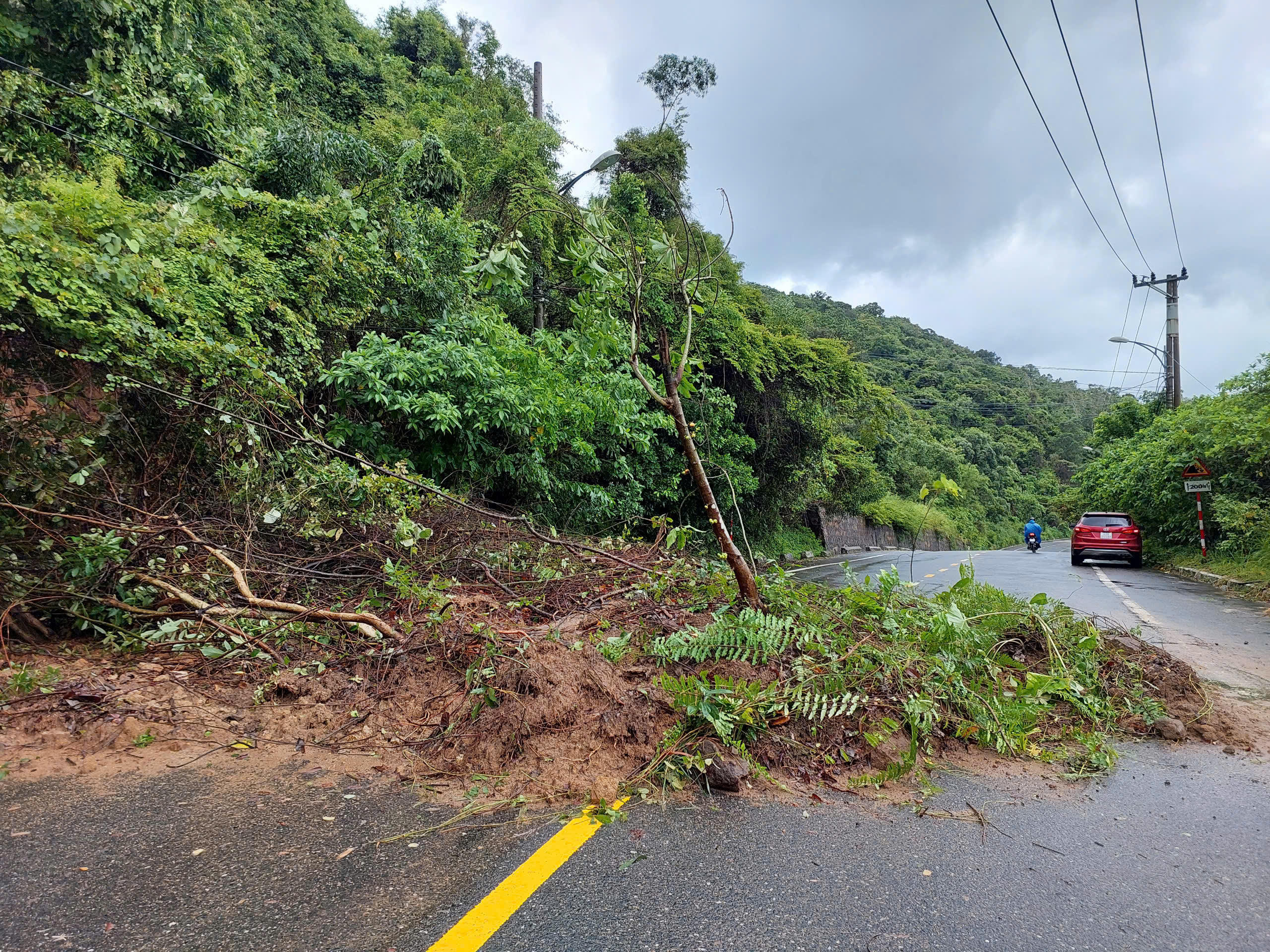 Tại khu vực gần chùa Linh Ứng và Bảo tàng Đồng Đình, đất đá, cây xanh từ taluy dương tràn xuống, phủ kín phần lớn mặt đường.