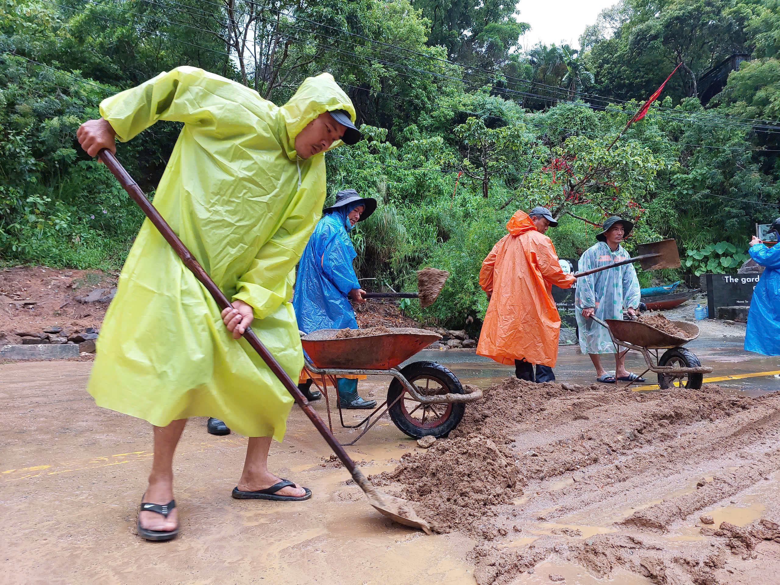 Lực lượng chức năng có mặt tại bán đảo Sơn Trà để dọn dẹp những tảng đá nhỏ lăn ra mặt đường. Đối với điểm sạt lở lớn, lực lượng chức năng đang huy động phương tiện cơ giới để dọn dẹp