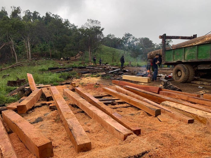Theo lời khai ban đầu, Khánh và Lợi thuê 8 đối tượng còn lại khai thác gỗ, xẻ hộp và dùng xe độ chế vận chuyển gỗ.
