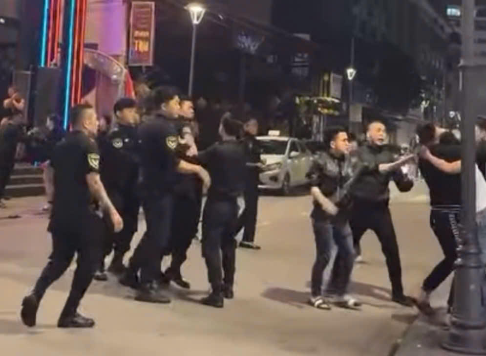 Hình ảnh các bảo vệ lao vào đánh Ngô Đức Thắng xảy ra trước cửa quán Quận 1 Beer Garden. |