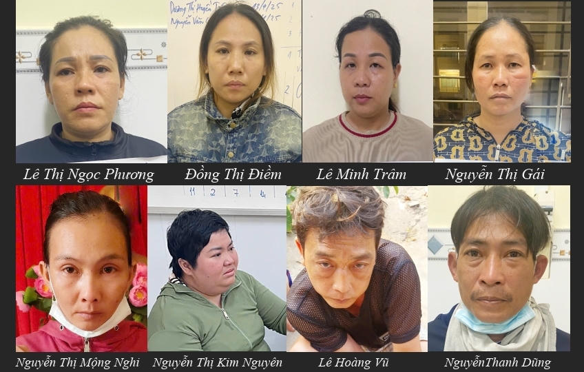 Các đối tượng bị tạm giữ gồm: Phan Văn Triết (SN: 1984) được xác định là chủ mưu, cầm đầu; Lê Thị Ngọc Phương (SN: 1987); Đồng Thị Điềm (SN:1987, cùng trú TP Long Xuyên, tỉnh An Giang); Nguyễn Thanh Dũng (SN: 1982); Nguyễn Thị Gái (SN: 1985, cùng trú huyện Châu Phú, tỉnh An Giang); Lê Hoàng Vũ (SN: 1983, trú thị xã Tân Châu, tỉnh An Giang); Nguyễn Thị Mộng Nghi (SN: 1995, trú quận Thốt Nốt, TP Cần Thơ); Nguyễn Thị Kim Nguyên (SN: 1993, trú huyện Châu Thành A, tỉnh Hậu Giang) và Lê Minh Trâm (SN: 1992, trú TP. Rạch Giá, tỉnh Kiên Giang).