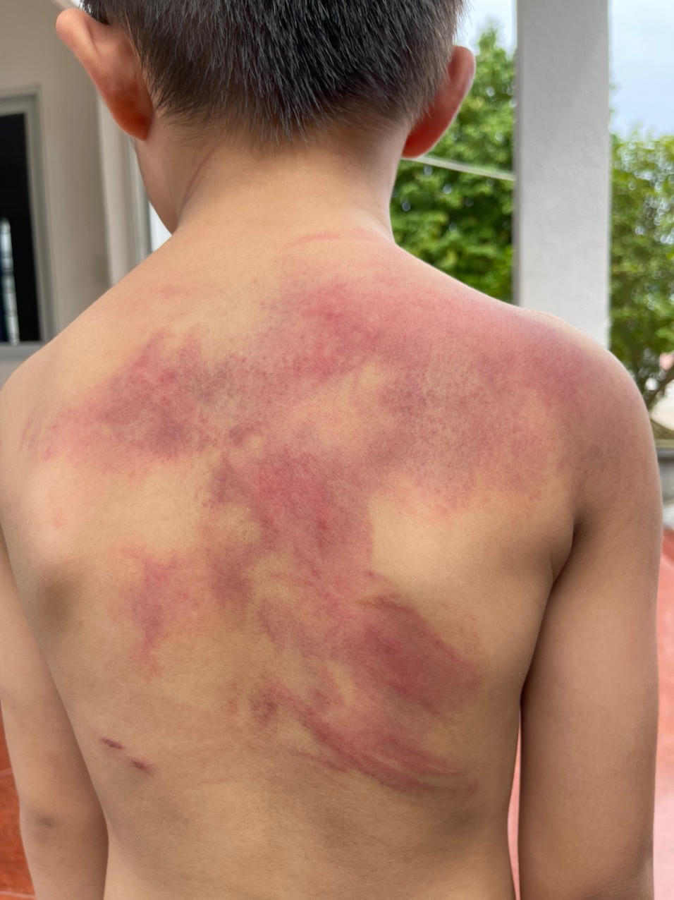 Cháu Đ. bị nhiều vết bầm trện cơ thể do cha ruột đánh |