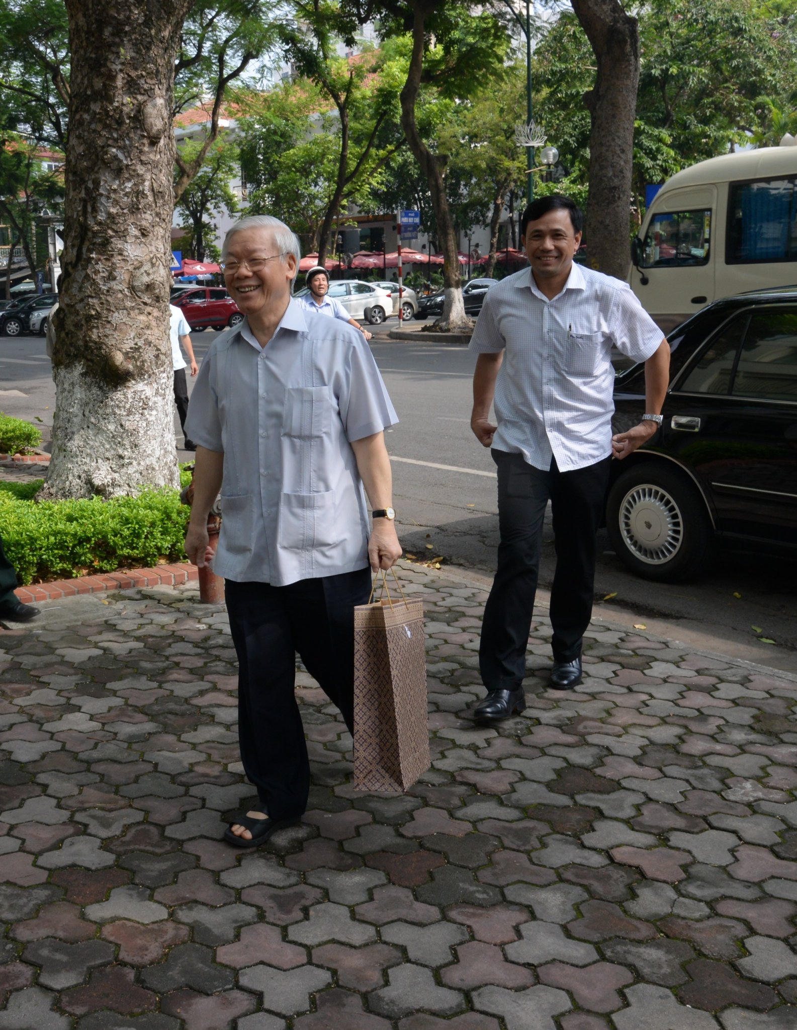 Tổng Bí thư Nguyễn Phú Trọng (bên trái) đến dự họp lớp Văn khóa 8, Khoa Văn, Đại học Tổng hợp Hà Nội. (Ảnh: Vũ Huyến) |