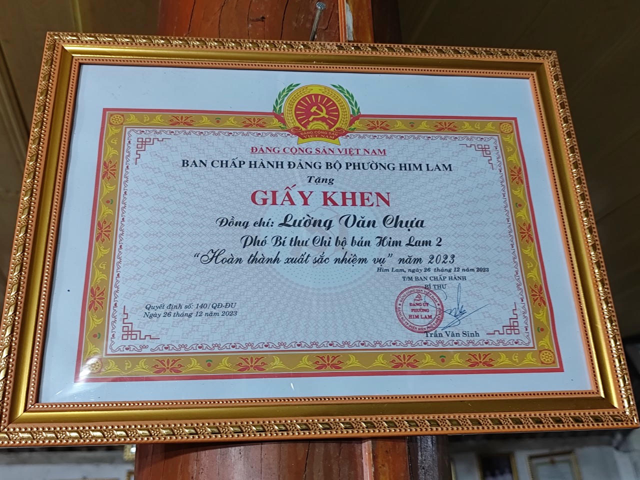 Tại ngôi nhà sàn của ông Lường Văn Chựa treo rất nhiều bằng khen khen thưởng những thành tích cá nhân và tập thể trong công tác Đảng, chính quyền, đoàn thể xây dựng và phát triển bản Him Lam 2, qua đó góp phần phát triển kinh tế - xã hội trên địa bàn thành phố Điện Biên Phủ như: Bằng khen của Ủy ban MTTQ thành phố Điện Biên cho thành tích xuất sắc trong công tác đại đoàn kết dân tộc giai đoạn 2003 - 2023; Bằng khen Phó Bí thư Chi bộ bản đã hoàn thành xuất sắc nhiệm vụ năm 2023...
