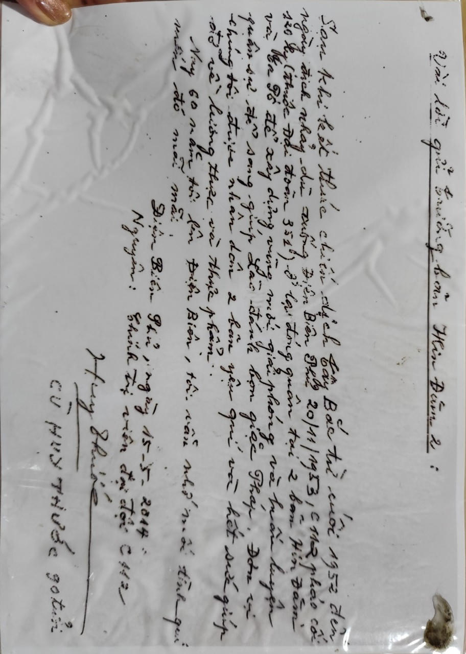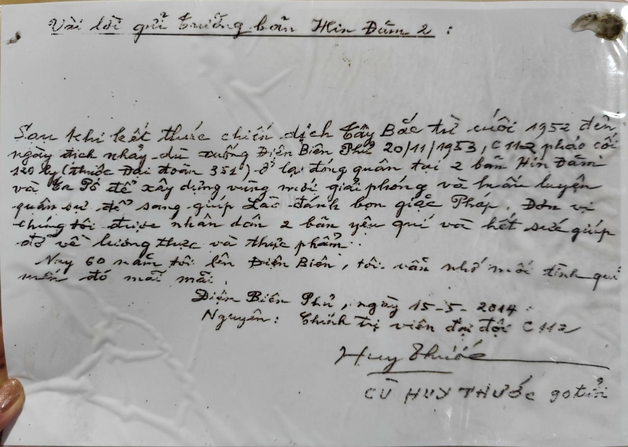 Cũng theo ông Lường Văn Chựa, vào những năm Chiến dịch Điện Biên Phủ, gia đình ông với vai trò là đứng đầu bản đã cùng bà con trong bản hết lòng giúp đỡ bộ đội về lương thực, thực phẩm. Ơn nghĩa khắc ghi, ngày 15/5/2014, vào dịp kỷ niệm 60 năm Chiến thắng Điện Biên Phủ, cựu chiến binh Cù Huy Thước khi đó đã 90 tuổi, nguyên là Chính trị viên Đại đội C112 đã không quản ngại khó khăn, tuổi cao, sức yếu tìm đến tận nơi để cảm ơn. “Vài lời gửi trưởng bản Hin Đăm 2: Sau khi kết thúc Chiến dịch Tây Bắc từ cuối 1952 đến ngày địch nhảy dù xuống Điện Biên Phủ 20/11/1953, C112 pháo cối 120 ly (thuộc Đại đoàn 351) ở lại đóng quân tại hai bản Hin Đăm và Ta Pô để xây dựng vùng mới giải phóng và huấn luyện quân sự để sang giúp Lào đánh bọn giặc Pháp. Đơn vị chúng tôi được Nhân dân hai bản yêu quý và hết sức giúp đỡ về lương thực, thực phẩm. Nay 60 năm tôi lên Điện Biên, tôi vẫn nhớ mối tình quý mến đó mãi mãi” - ông Cù Huy Thước viết sau bức ảnh lưu niệm chụp với gia đình con cháu vị trưởng bản đã từng giúp bộ đội năm xưa.