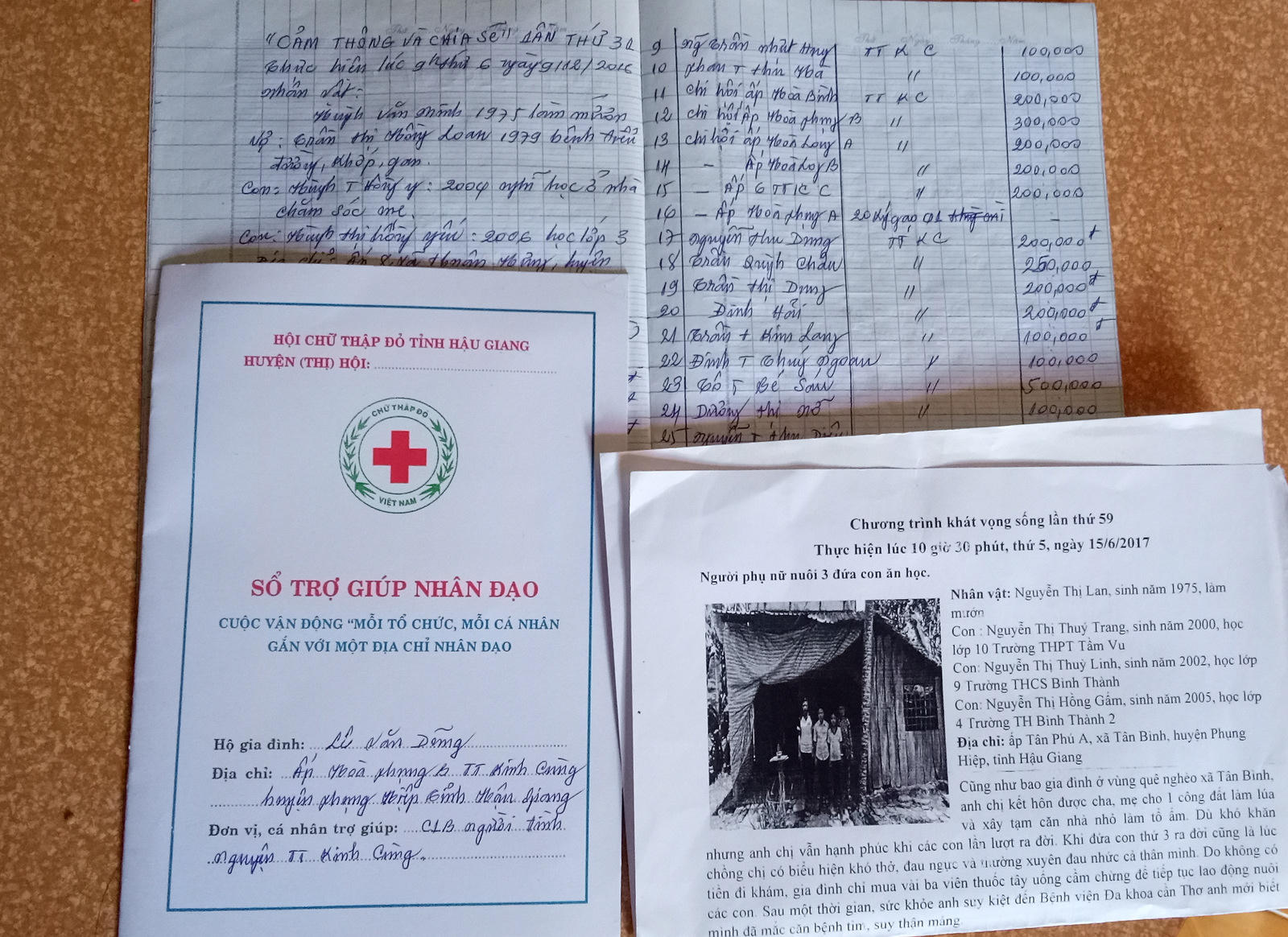 | Sổ sách ghi thông tin đóng góp của các tiểu thương và sổ hỗ trợ hàng tháng cho hộ nghèo đều được bà Chi ghi chép và cất giữ cẩn thận |